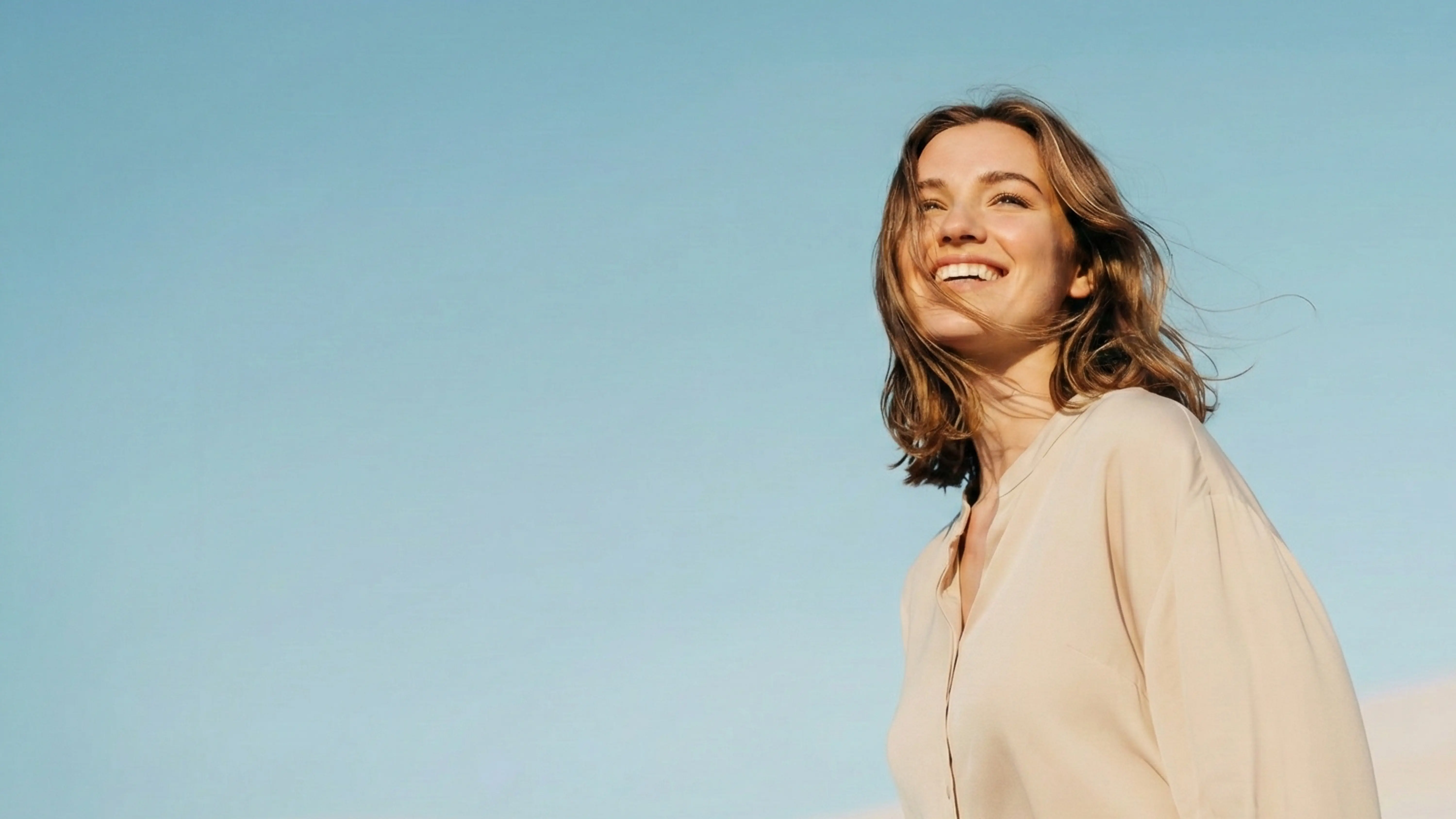 Smiling woman in beige blouse against clear blue sky, looking upward in bright natural light.